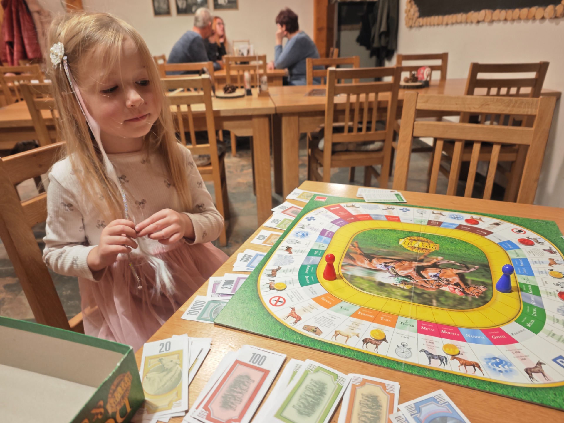 Ubytovaly jsme se v miniaturním pokojíčku s ledničkou, mikrovlnkou a varnou konvicí. Zašly jsme dolů do restaurace, kde jsme si obsadily jeden menší stůl. Štěpánka nejdříve vytáhla nějaké svoje tvoření, a když ji to přestalo bavit, dotáhla jsem Dostihy a sázky. Přemýšlela jsem, jak to co nejvíc zjednodušit, a nakonec jsem se rozhodla pro úplně ořezanou verzi, kdy jsme si v podstatě jen kupovaly koně a když někdo šlápl na koně toho druhého, musel mu zaplatit. Výherce byl ten, kdo nakoupil víc koní. Hra nás zabavila skoro na hodinu. Pak přišel už čas na večeři a hurá na kutě.