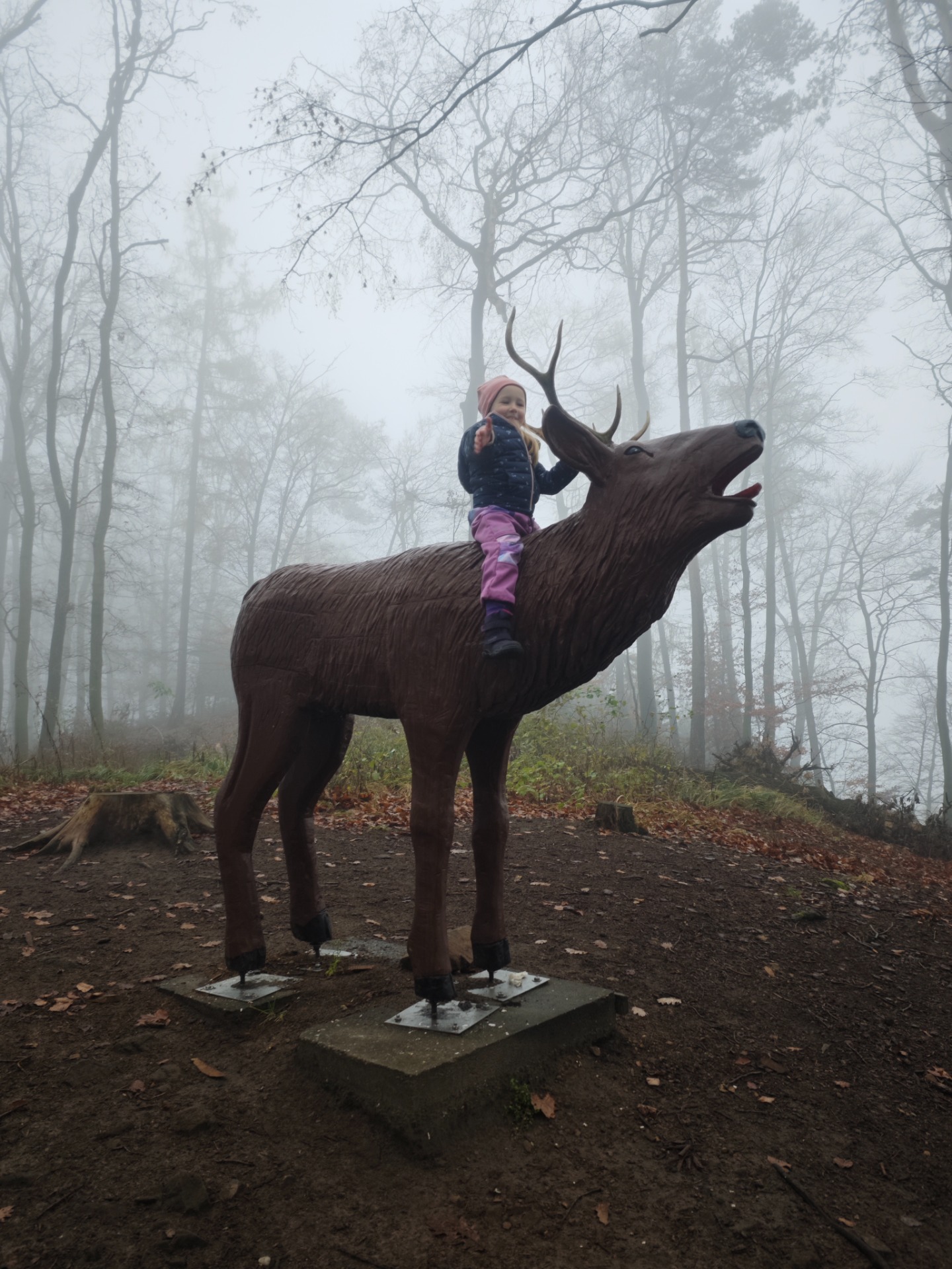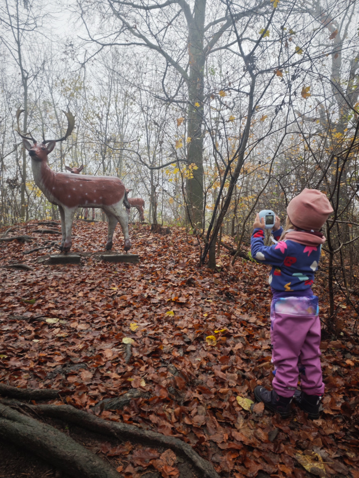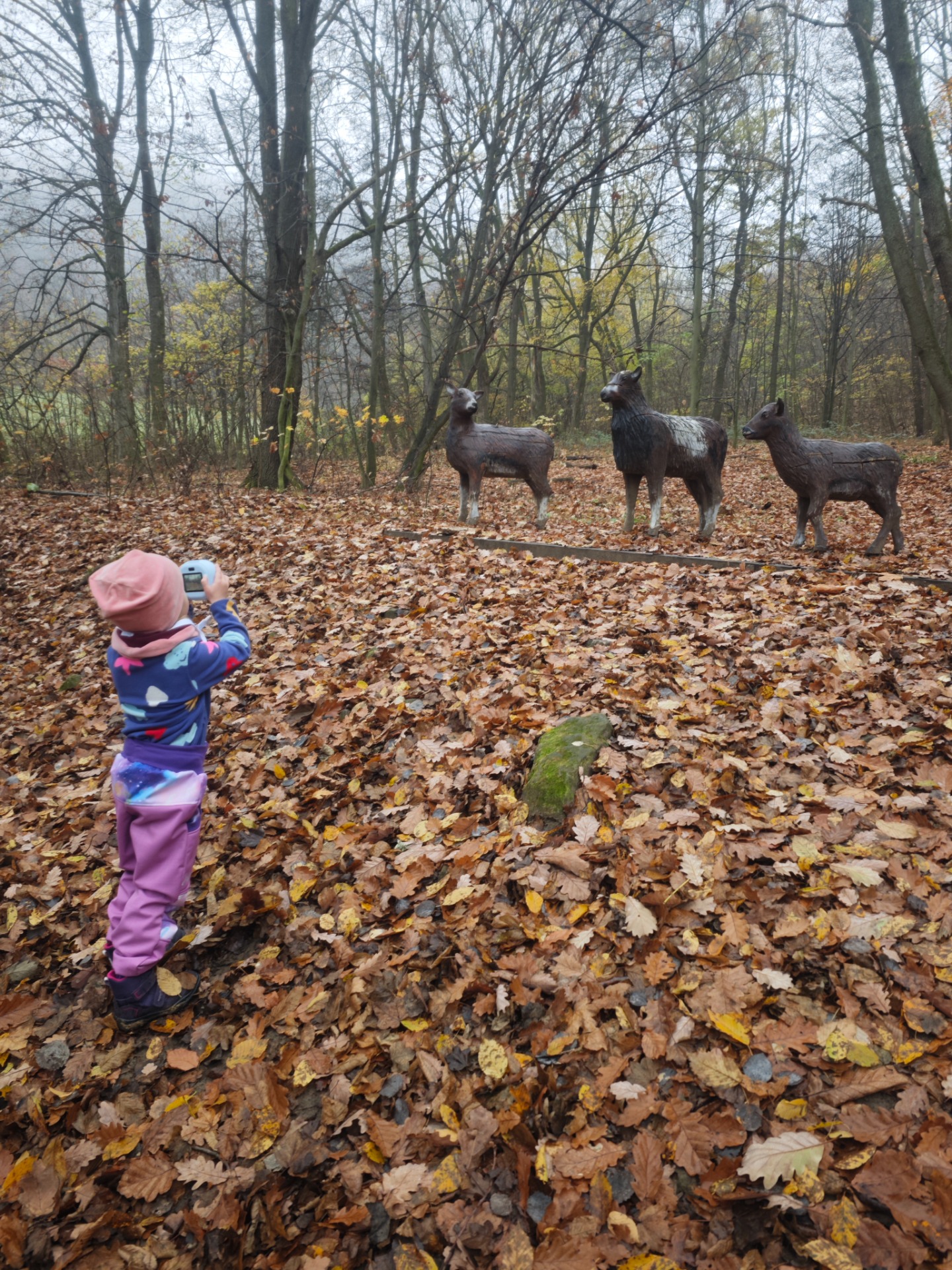 Na druhý den jsem si vymyslela menší výšlap kolem hradu Buchlov. Hned od penzionu vedou turistické značky a my jsme se po červené vydaly vstříc bahnu. Už po pár krocích mi bylo jasné, že čisté zpět na penzion určitě nedojdeme. Cestu do kopce jsme si zpříjemnily hrou na vlky (někdo řekne: "Slyším vlky," a všichni musí vylézt na něco, aby se nedotýkali země). Kolem hradu vede naučná turistická stezka, která je tvořena informačními tabulemi a sochami lesních zvířat. Potkaly jsme daňky, prasata, jelena s laní, muflony. Štěpánka ke svátku dostala dětský foťák, a tak si všechna zvířátka poctivě fotila, a když došly zvířátka, dokumentovala les, houby, kytky a všude přítomné listí.