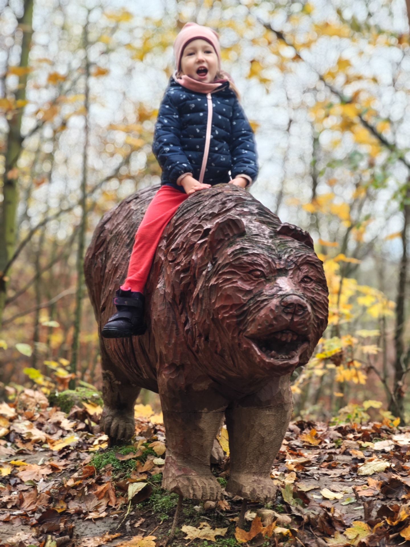 Po naučné stezce, kolem soch rodinky divočáků, jsme se napojily zpět na červenou značku, po které jsme došly zpět k penzionu. U penzionu jsme si chvilku pohrály na dětském hřišti a pak už šly do tepla.