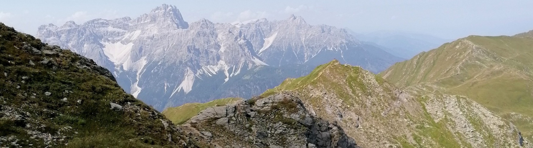 Za chatou Wolayerseehütte nás trail ještě zavedl na chvilku do lesa, ale ten postupně zmizel a zůstaly už jen holé hřebeny hor. Úzká horská pěšinka nás vedla chvíli nahoru, pak dolů, a tak pořád dokola. Procházeli jsme po hranici Rakouska a Itálie – vlevo výhled na skalnaté, špičaté Dolomity, vpravo na zelené, kulaté rakouské hory. Na loukách pod námi na Italské straně se pásly ovce, na Rakouské straně zase krávy.